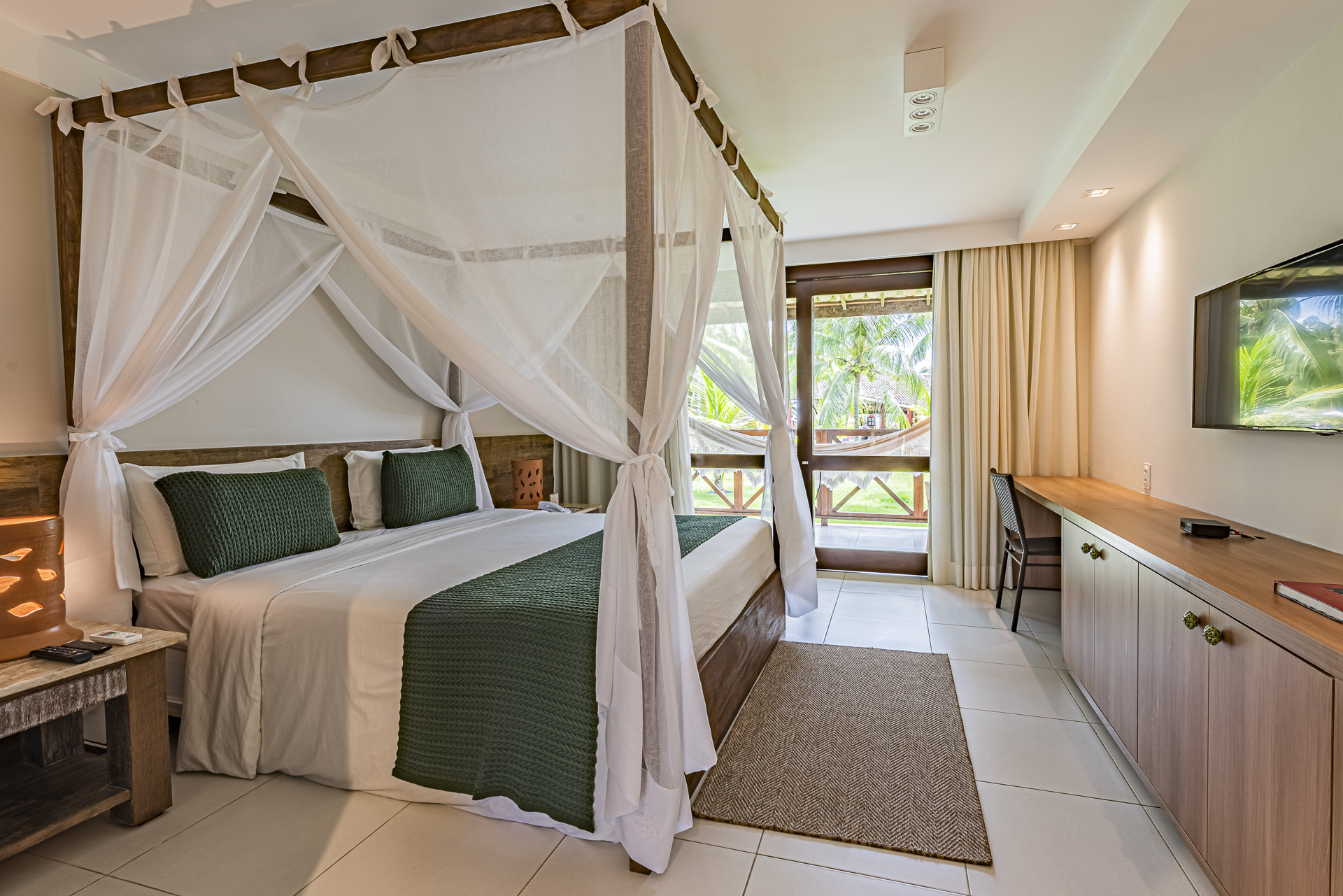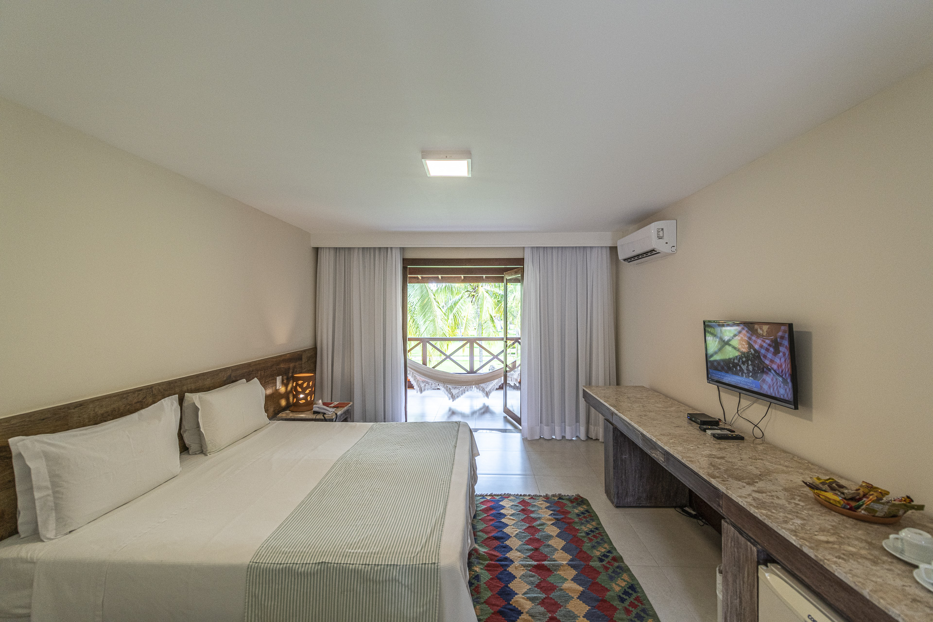 - Bangalôs Luxo: 30m², cama king size ou duas camas de solteiro, varanda privativa com rede, ar-condicionado, frigobar, TV smart, Wi-Fi e amenities Natura. Para casais ou famílias.