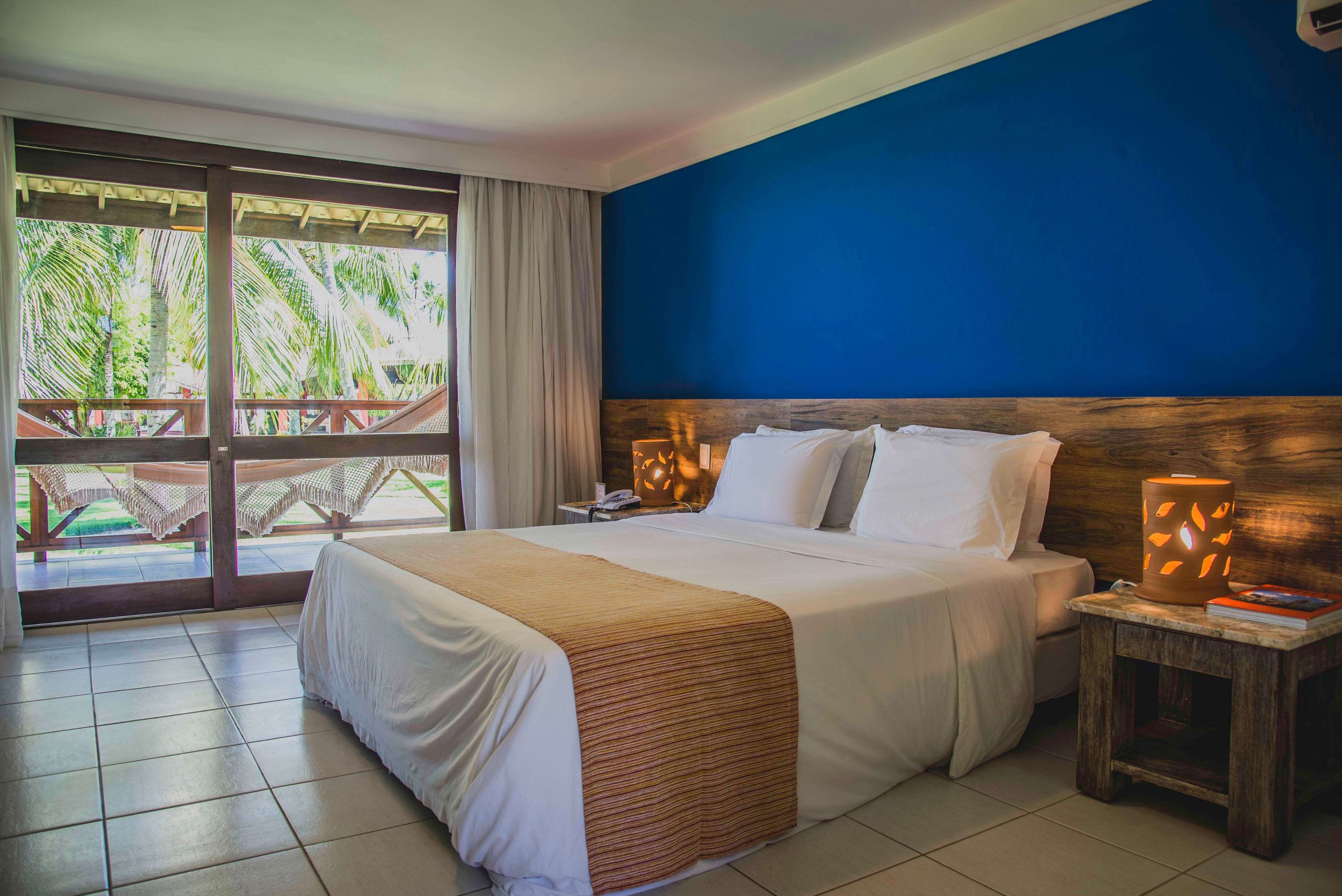 - Bangalôs Master: 40m², cama king size, varanda privativa com rede, ar-condicionado, frigobar, TV smart, Wi-Fi e cafeteira Nespresso. Ideal para casais românticos.