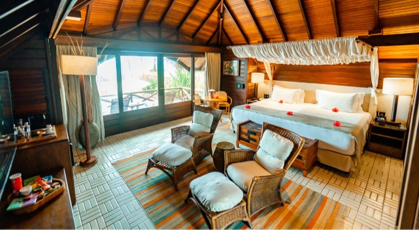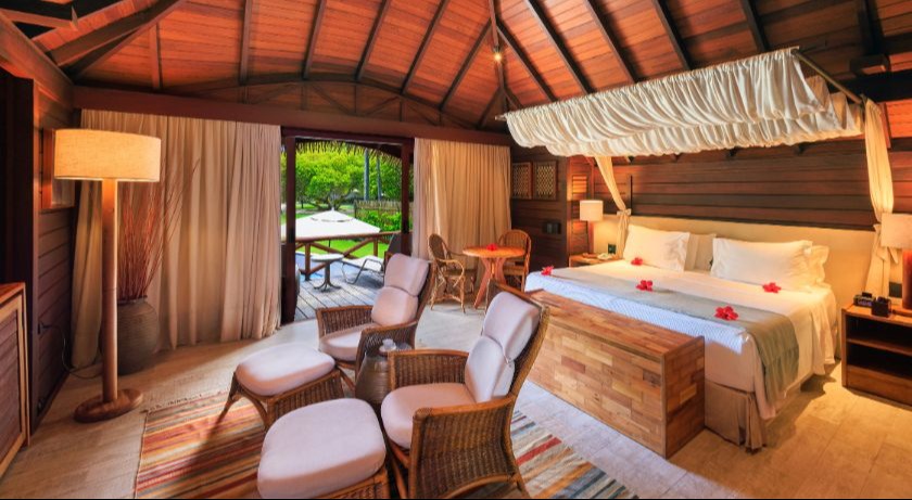 Desenhado para proporcionar conforto e privacidade, o Bangalô Piscina conta com uma área de 64m² distribuída entre lâminas d’água e jardins encantadores. Com uma piscina privativa de profundidade variada e uma ampla varanda, este bangalô é um refúgio de luxo. A área de estar, composta por sofá e mesa de jantar, está harmoniosamente conectada ao quarto do casal, criando um ambiente acolhedor. Comodidades incluem TV por assinatura, ar-condicionado, rádio-relógio, banheira e ducha (independentes), secador de cabelo, telefone, frigobar, máquina de café expresso e cofre eletrônico. Política de cobrança para crianças: De 0 a 12 anos – adicionar 30% por criança sobre o valor da diária do duplo.